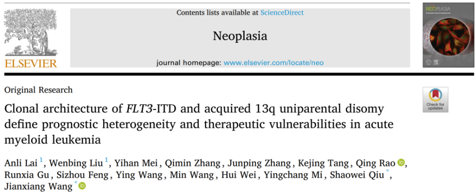 近日,中国医学科学院血液病医院(中国医学科学院血液学研究所)王建祥/邱少伟教授团队于2025年12月在《Neoplasia》(IF=7.7分)在线发表论著“Clonal architecture of FLT3-ITD and acquired 13q uniparental disomy define prognostic heterogeneity and therapeutic vulnerabilities in acute myeloid leukemia”。该研究揭示了 FLT3-ITD 的克隆起源及 13q UPD 在 AML 精准分层与治疗中的关键作用。