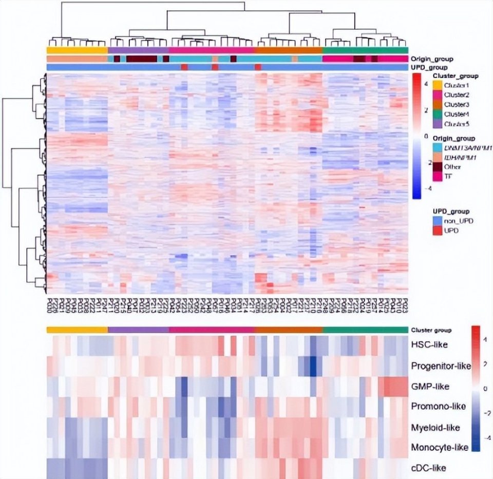 研究发现,不同起源亚型的预后截然不同,这为精准分层提供了全新的视角。在四种亚型中,DNMT3A/NPM1 起源的患者预后最差,这与既往的研究报道一致。但该克隆起源的患者仍具有一定的异质性,其内部根据细胞分化状态进一步分为“造血干细胞(HSC)样”和“单核细胞(Mono)样”两个亚群。其中,呈现 HSC 表达特征的患者初诊时肿瘤负荷更高,无病生存(EFS)显著缩短。