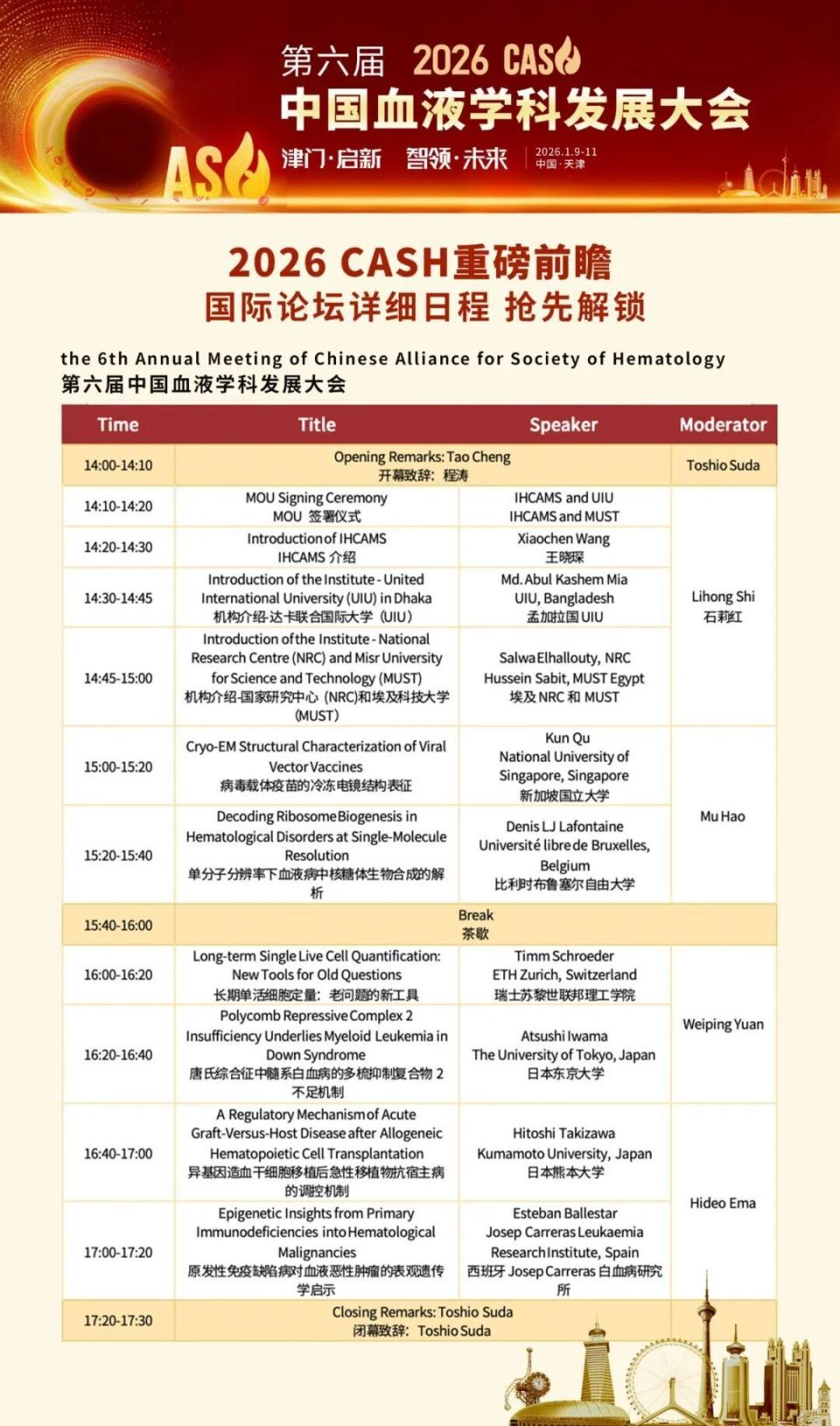 新元起航,相聚津门。由中国医学科学院血液病医院(中国医学科学院血液学研究所)主办的第六届中国血液学科发展大会(CASH)将于2026年1月9日至11日在中国天津盛大举行。自2021年首届举办以来,CASH已成为血液学领域最具影响力的学术盛会之一,回顾前五届,大会相继邀请了国内外顶尖专家学者,吸引千万余线上线下参会者,聚焦国家战略,交流最新研究成果,探讨学科发展趋势,推动我国血液学科与国际接轨,为健康中国战略实施发挥不可替代的作用。