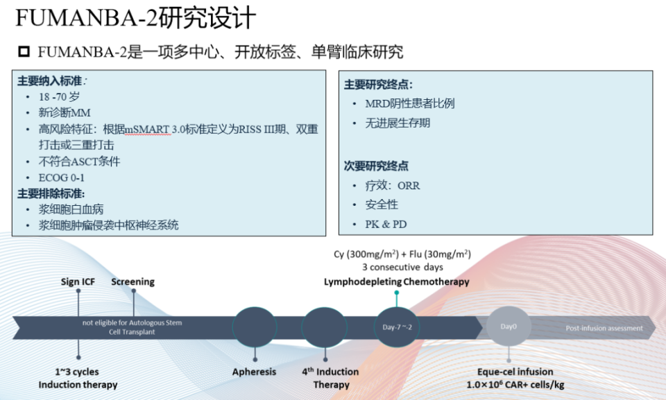 FUMANBA-2是一项针对高危NDMM患者的多中心、单臂、开放标签的Ⅰ期临床研究。研究纳入18至70岁的成人初诊MM患者,根据mSMART 3.0标准被定义为具有高风险特征,包括RISS III期、双重打击或三重打击,且不适合进行ASCT。主要研究终点是MRD阴性患者的比例和无进展生存期(PFS),次要研究终点包括客观缓解率(ORR)、缓解持续时间、安全性、药代动力学和药效学。患者入组后将完成4个周期的诱导治疗,在第3个诱导周期后完成移植资格的评估,不适合移植的受试者将进行单个核细胞采集术,随后完成第4个周期的诱导治疗。不同于FUMANBA-1研究,本研究人群整体耐受性差,故对伊基奥仑赛回输后的预处理方案进行了调整,受试者将接受连续3天的环磷酰胺300 mg/m2和氟达拉滨30 mg/m2,随后完成1.0×106 CAR+ cells/kg剂量的细胞回输。