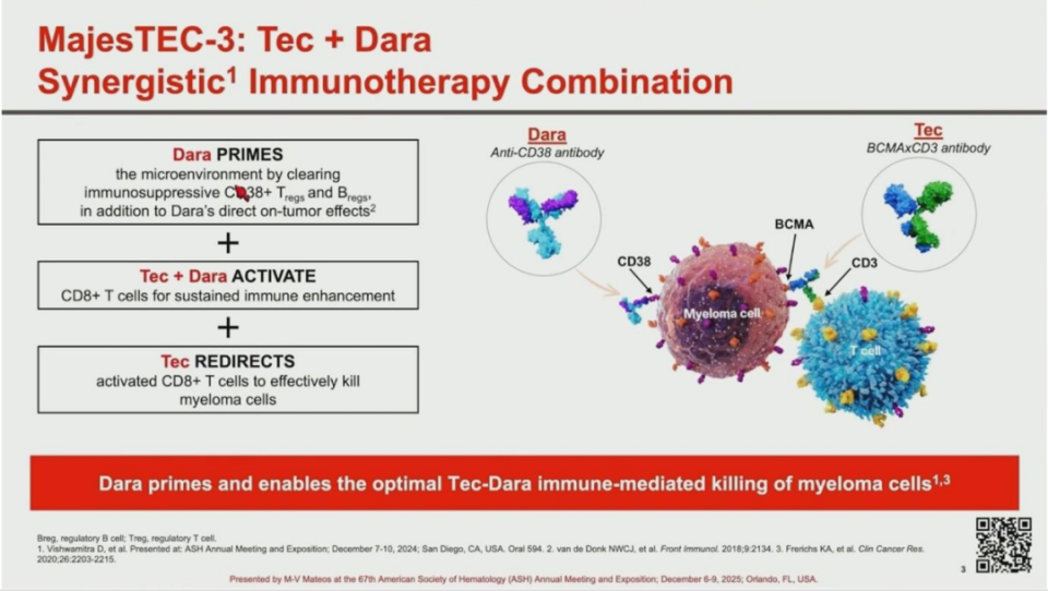 María-Victoria Mateos博士总结指出,MAJEStec-3研究是RRMM治疗领域的重大突破。Daratumumab对免疫抑制细胞的“清除”作用,联合Teclistamab的“重定向杀伤”效应,产生了强效的协同作用。