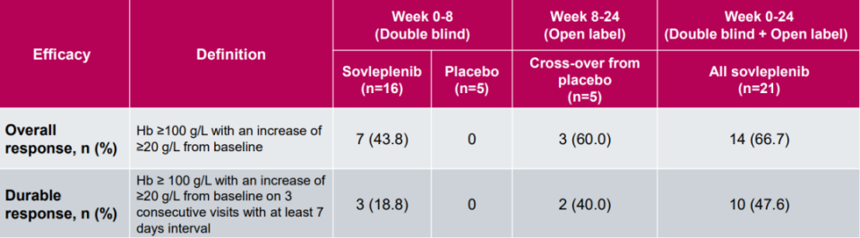 在治疗起效时间方面,在起始就接受索乐匹尼布治疗的患者中,Hb水平较基线增加≥15 g/L的中位时间为1.3周。在整体患者人群中,接受索乐匹尼布治疗的患者达到Hb≥100 g/L,并且较基线增加≥20 g/L的中位时间为4.9周。此外,在持续缓解的作用方面,根据24周研究数据,索乐匹尼布治疗的中位缓解持续时间达到20.5周。