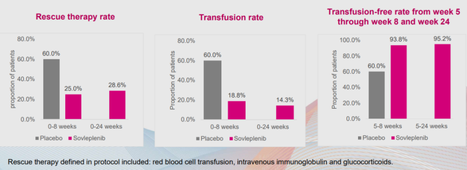 研究数据表明,与安慰剂相比,在wAIHA患者中在0至24周期间,索乐匹尼布组的总体应答率(OR)达到66.7%,持续应答率(DR)达到47.6%,在0至8周的双盲治疗期间,索乐匹尼布组患者的Hb总体应答率(OR)达到43.8%,而持续应答率(DR)为18.8%,这两项指标均高于安慰剂组的表现,后者OR和DR均为0%。此外,在利妥昔单抗经治的患者中,索乐匹尼布OR率和DR率分别为62.5%和37.5%。这些结果或可在一定程度上表明索乐匹尼布未来在wAIHA治疗领域具有潜在的临床意义。