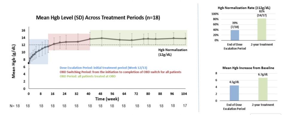 除1例合并骨髓增殖性肿瘤(MPN)患者在第90周退出研究外,其余患者均接受了为期2年的治疗,其中包括64–105周的OBD治疗。在17例患者中,有12例自愿进入治疗结束后的8周安全性随访期,用于评估疗效持久性及安全性。