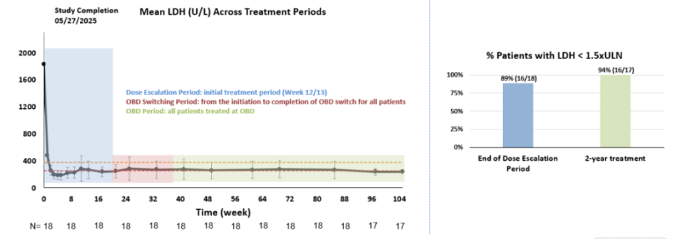 在2年治疗期间,记录到2例突破性溶血(BTH)事件:1例发生于最低剂量队列、OBD转换前,与胃肠炎相关;1例发生于合并MPN的患者,在OBD治疗期间。研究期间未观察到重大血管事件,亦未发现超出既往(ASH 2024)报道的新安全性信号。