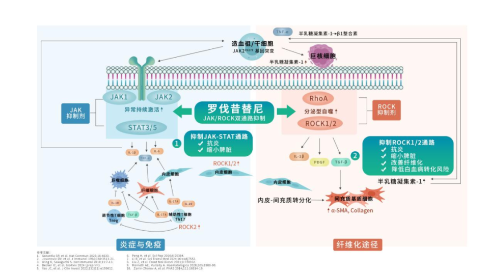 此外,罗伐昔替尼还能作用于骨髓微环境,实现多维改善:在纤维化骨髓中,间充质基质细胞与巨核细胞会高度表达半乳糖凝集素-1(Gal-1),强化微环境的恶性化18,而罗伐昔替尼通过同时抑制JAK1/2与ROCK1/2,不仅削弱了TNFα信号,还降低了Gal-1的恶性诱导作用,从而优化整体微环境“土壤”,筑牢治疗获益根基。