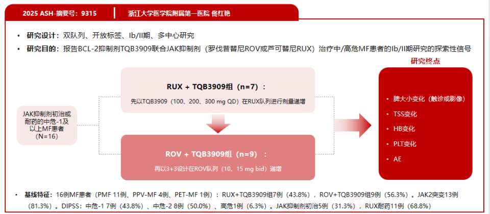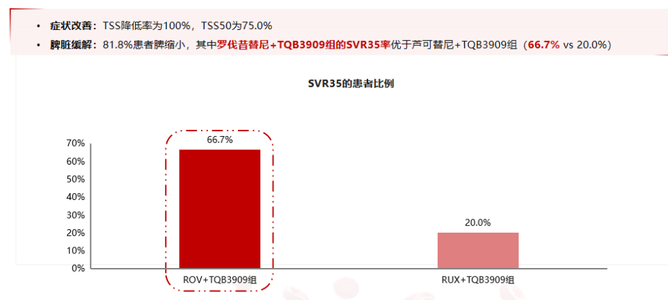 罗伐昔替尼与BCL-2抑制剂联合应用则是临床正在探索的另一研究方向。浙江大学医学院附属第一医院黄健教授开展的TQB3909联合JAK抑制剂用于中高危MF患者的Ib/II期多中心研究(NCT06245941)明确了罗伐昔替尼+BCL-2抑制剂在脾脏缩小、症状改善及贫血获益方面,较芦可替尼联合组更为突出,尤为惊喜的是罗伐昔替尼组SVR35率高达66.7%(vs.芦可替尼组20.0%)24。