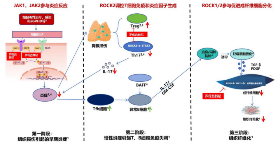 通过“双通路调控、抗炎控纤并重”的核心机制,罗伐昔替尼治疗价值也成功延伸至移植物抗宿主病(GVHD)领域,目前已被纳入突破性疗法25。由浙江大学医学院附属第一医院黄河教授、赵妍敏教授团队主导的Ib/IIa期临床研究结果,已在国际血液学顶级期刊Blood上发表26,为全球GVHD患者带来更优治疗可能。