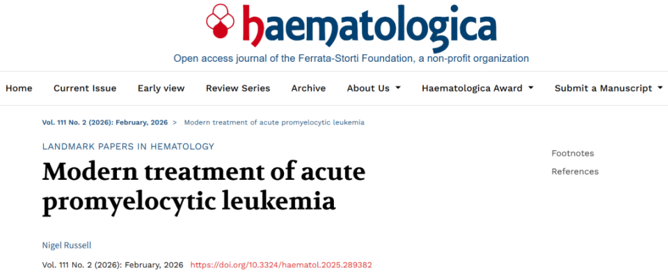 Russell N. Modern treatment of acute promyelocytic leukemia. Haematologica. 2026 Feb 1;111(2):437-438. doi: 10.3324/haematol.2025.289382. PMID: 41622919; PMCID: PMC12862338