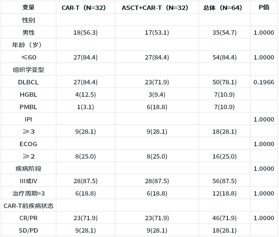 本研究为单中心、倾向评分匹配(PSM)队列研究,共分析64例复发/难治性非霍奇金淋巴瘤(R/R NHL)患者。其中,32例患者接受ASCT联合CAR-T细胞治疗;按1:1比例,与32例单纯接受CAR-T治疗的患者匹配;匹配依据为10项基线特征(见表1)。经PSM后,两组在所有基线特征方面达到良好平衡,适合进行进一步的结局比较分析。既往接受过CAR-T治疗或ASCT治疗的患者被排除。ASCT+CAR-T组的预处理方案为标准BEAM方案(卡莫司汀、依托泊苷、阿糖胞苷和美法仑),在CD34+造血干细胞输注后两天内输注CAR-T细胞。
