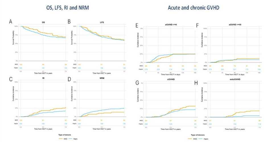以色列拉马特甘的Arnon Nagler比较了“使用移植后环磷酰胺时,治疗继发性急性髓系白血病:年长同胞供者 vs. 年轻单倍体供者”(OS03-06)。对于接受移植后环磷酰胺预防的继发性AML患者,选择年轻单倍体供者还是年长同胞供者一直存在争议。这项EBMT研究对406例患者进行了比较,结果显示,两组在2年总生存、无白血病生存、复发率及无GVHD无复发生存方面均无显著差异。然而,具体并发症谱存在差异:年轻单倍体供者组有更高的非复发死亡率和稍慢的中性粒细胞植入,但广泛型慢性GVHD发生率显著更低;而年长同胞供者组广泛型慢性GVHD更高。这表明,在PTCy平台下,两种供者来源为继发性AML患者提供了总体可比的生存结局,但毒性谱不同,临床选择需权衡非复发死亡率与慢性GVHD风险,进行个体化决策。