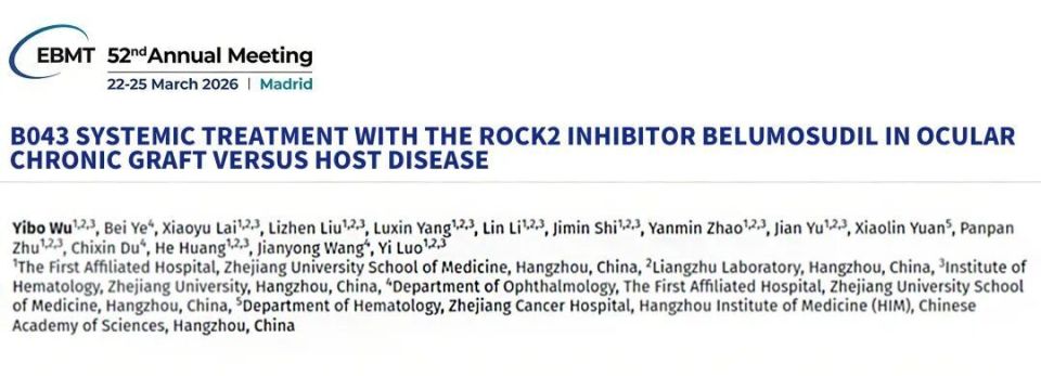 2026年3月22日至25日,第52届欧洲血液与骨髓移植学会(EBMT)年会在西班牙马德里盛大召开。慢性移植物抗宿主病(cGVHD)作为移植后的主要并发症,可累及全身器官,严重影响患者的生活质量和远期生存,其研究进展已成为会议焦点之一。贝舒地尔作为全球首个高选择性ROCK2抑制剂,凭借起效迅速、缓解持久、安全性良好等优势,为cGVHD治疗格局带来了重要突破。本届EBMT年会上,近20项贝舒地尔相关研究公布。其中,浙江大学医学院附属第一医院罗依教授主导的“ROCK2抑制剂贝舒地尔系统治疗眼部慢性移植物抗宿主病”(B043)研究,为优化眼部慢性移植物抗宿主病(oGVHD)患者的综合管理策略提供了重要的理论和实践依据。会议期间,《血液时讯》特邀罗依教授接受专访,解读研究结果与亮点,并深入探讨贝舒地尔的临床价值,以期为临床实践提供新思路。