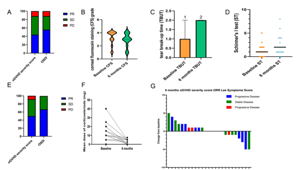 结果显示,44%(11/25)患者oGVHD严重程度评分改善、56%(14/25)患者眼表疾病指数(OSDI)改善,客观指标如角膜荧光素染色、泪膜破裂时间和Schirmer试验均有好转。值得注意的是,达到系统性总体缓解的患者眼部获益更明显,OSDI改善率达66.6%,且所有患者视力保持稳定。此外,48%患者成功实现了激素减量,无药物相关停药或严重血液学不良事件。
