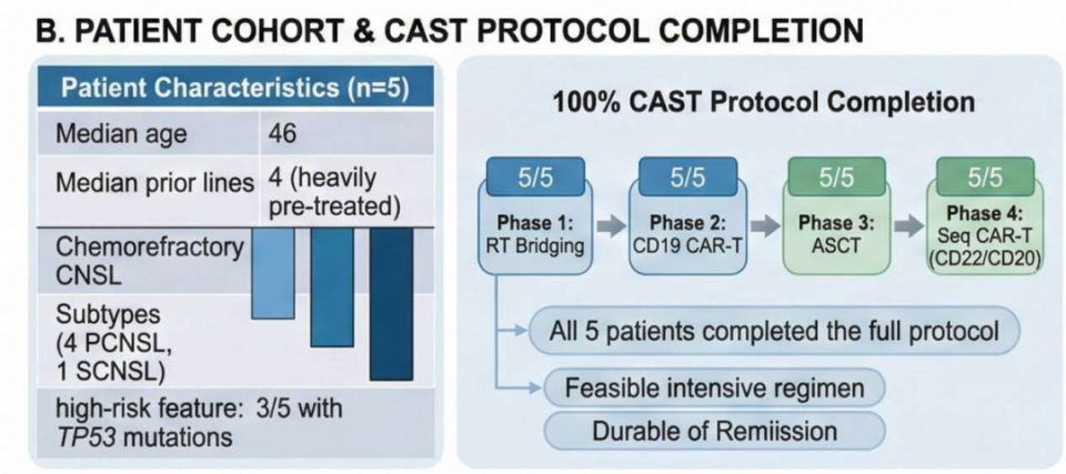我们假设,克服这种治疗耐药需要多模式协同的治疗策略。本研究评估了一种新的综合治疗方案——CAST策略,即整合CAR-T细胞治疗、自体造血干细胞移植(ASCT)及序贯CAR-T细胞治疗,并通过低剂量分次放疗进行桥接治疗。