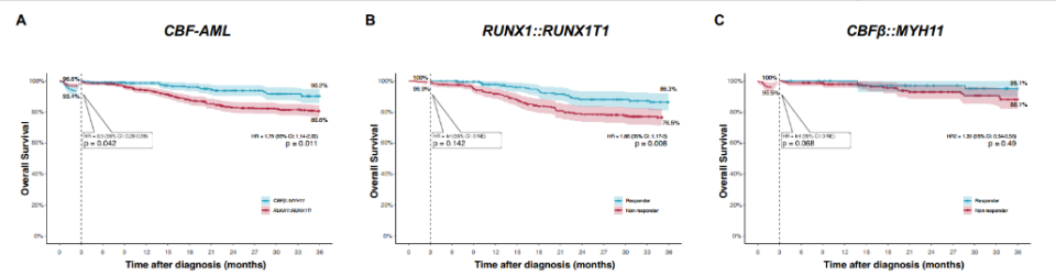 为探索这一问题,由上海瑞金医院、浙江大学附属第一医院、武汉同济医院、北京大学人民医院及苏州大学附属第一医院共同开展了一项多中心回顾性研究。该研究结果部分印证了既往的临床观察,但也揭示了新的规律。与以往认知一致的是,伴有CBFβ::MYH11融合基因的患者,其移植后早期死亡率确实高于RUNX1::RUNX1T1融合基因患者,但这一早期风险的增加并未转化为总生存率的差异。