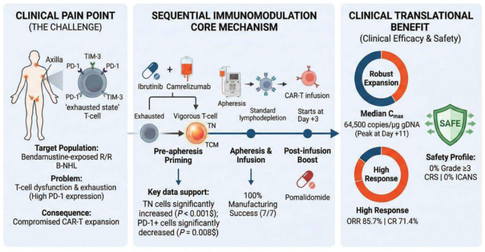 针对这一问题,本研究探索一种序贯免疫调节策略:在细胞单采前通过免疫调节改善T细胞状态,并在CAR-T输注后给予免疫增强治疗,以促进早期CAR-T扩增并加深临床缓解。