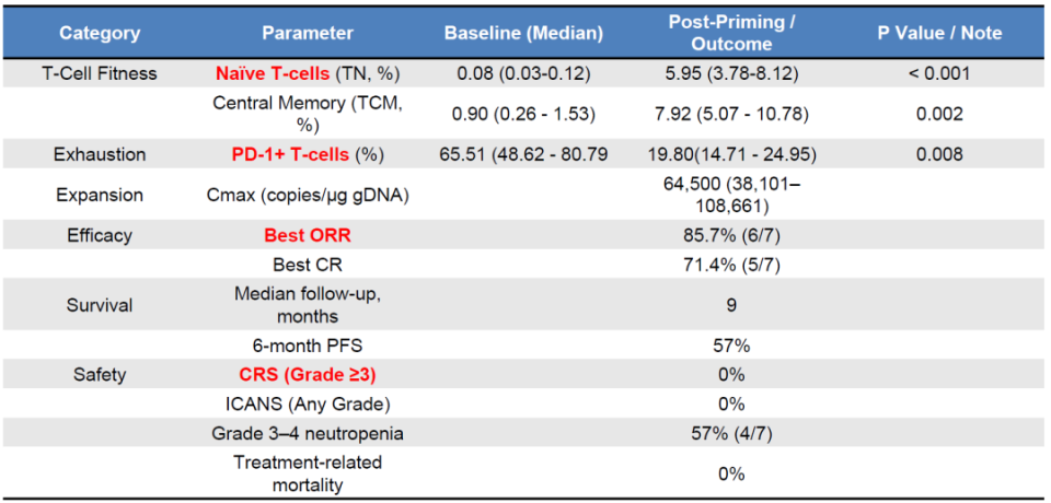 CAR-T制备:所有患者均成功完成单采及CAR-T细胞制备(成功率100%,7/7)。与基线水平相比,单采前预处理显著增加了未分化T细胞亚群,包括初始T细胞(TN)、中央记忆T细胞(TCM)及干细胞样记忆T细胞(TSCM),同时显著降低T细胞耗竭标志物(PD-1+ T细胞)水平。