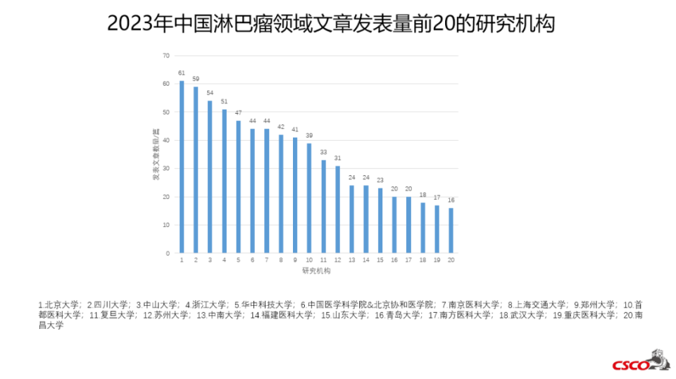 图2. 2023年中国淋巴瘤领域文章发表量前20的研究机构