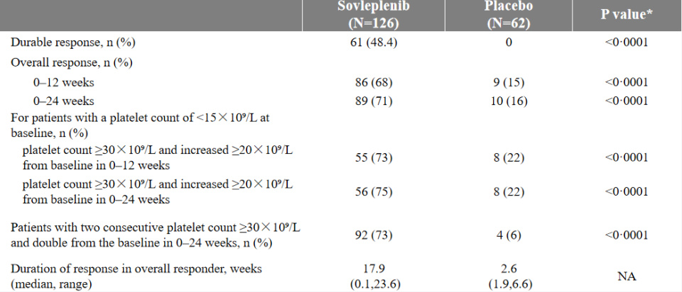 其次,索乐匹尼布的整体应答率达71%,对照组为16%。在索乐匹尼布治疗组中,血小板计数中位范围稳定在(50~90)×10⁹/L。此外,索乐匹尼布的治疗效应应答平稳,持续应答率达到48%,持续有效患者的血小板计数中位范围保持在(80~100)×10⁹/L。