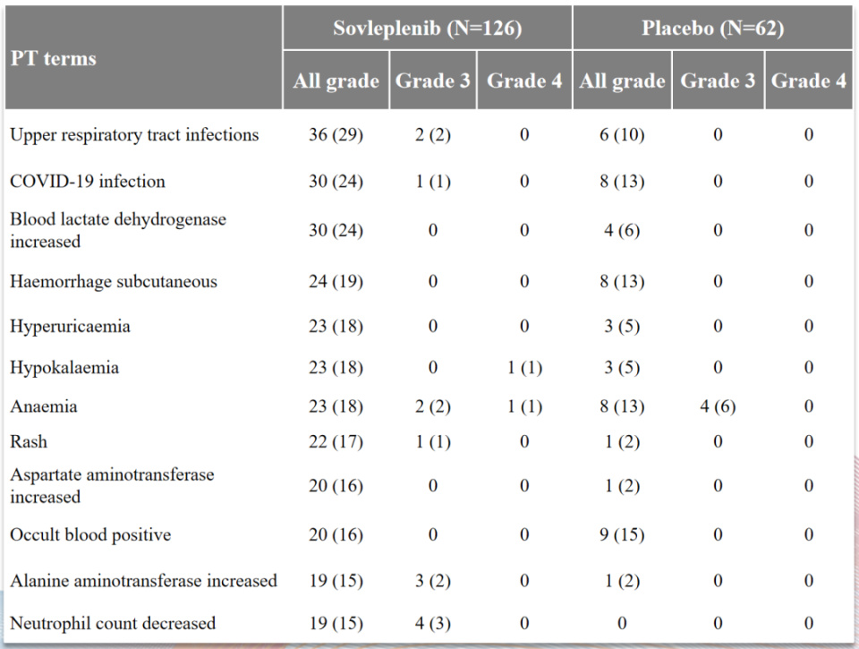 在ESLIM-01研究中,TEAEs包括上呼吸道感染(29%)和COVID-19感染(24%)等。这一现象可能与SYK抑制剂的作用机制相关,免疫抑制会增加感染的风险7。研究数据表明,与感染相关的TEAEs发生率未超过30%,且≥3级为1%~2%。在实际临床应用中,建议临床医生密切监测患者情况,以便尽可能有效预防和管理潜在的感染风险。