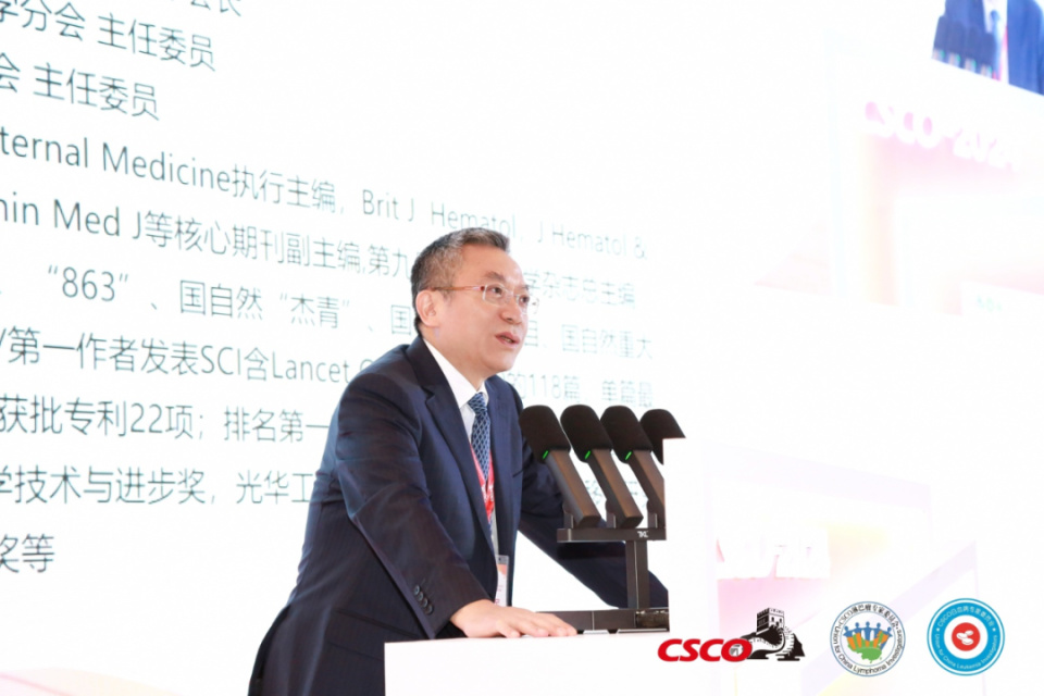 开幕式前奏,一段精心制作的视频带领大家回顾了中国血液学人不忘初心、持续探索,从蹒跚学步到踏入国际,书写中国血液学传奇的光辉历程,让人热血沸腾、勇往直前。紧接着,在哈尔滨血液病肿瘤研究所所长马军教授主持下,开幕式正式开始。马教授对参加本次大会的专家及参会者致以热烈的欢迎和诚挚的感谢,并介绍莅临大会的领导和专家:中国工程院院士、山东第一医科大学(省医学科学院)名誉校(院)长、山东省肿瘤医院院长于金明院士,中国工程院院士、哈尔滨医科大学党委书记张学院士,中国工程院院士、北京大学血液病研究所所长黄晓军院士;上海交通大学医学院附属瑞金医院沈志祥教授,我国骨髓移植领域的开拓者、河北燕达陆道培医院张伯龙教授;中国医药创新促进会执行会长宋瑞霖教授,国家药品监督管理局药品审评中心(CDE)生物制品临床部原部长、昌平国家实验室领衔科学家高晨燕教授;中华医学会血液学分会现任主任委员、苏州大学附属第一医院吴德沛教授,中华医学会血液学分会候任主任委员、华中科技大学同济医学院附属协和医院胡豫教授,中华医学会血液学分会前任主任委员、中国医学科学院血液病医院(中国医学科学院血液学研究所)王建祥教授;国际T细胞淋巴瘤联盟主席、弗吉尼亚大学癌症中心Owen O’Connor教授,国际顶尖细胞学专家、梅奥诊所林毅教授以及CSCO的领导和专家们等。