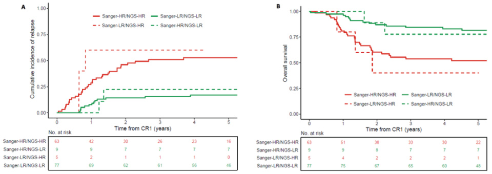 总体而言,在成人患者中,LR-NGS分类患者的5年CIR为21%(95%CI:14%-29%)(n=108),而HR-NGS分类患者的5年CIR为47%(95%CI:36%-57%)(n=90)(P<0.0001)。LR-NGS分类患者的5年OS为83%(95%CI:76%-90%),而HR-NGS分类患者的5年OS为55%(95%CI:45%-66%)(P<0.0001)。