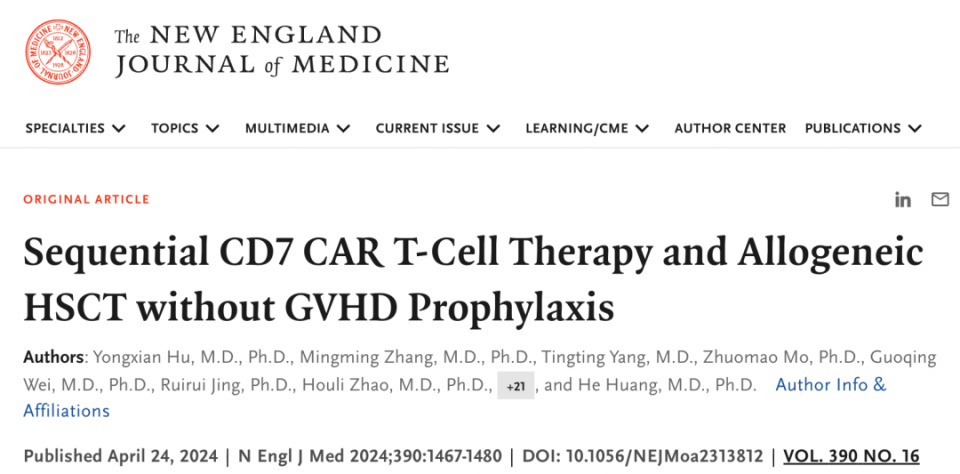 在探索新型细胞免疫治疗的征途上,力求在既有药物的基础上寻求疗效与安全性的双重飞跃。浙江大学医学院附属第一医院骨髓移植中心在此方面取得了显著进展,特别是针对新靶点的研究,为血液系统恶性疾病的治疗开辟了新途径。我们知道,靶向CD7的CAR-T细胞疗法成功地为T细胞急性淋巴母细胞白血病(ALL)、T细胞淋巴母细胞淋巴瘤及部分表达CD7的急性髓系白血病(AML)患者带来了福音。我们团队在CD7 CAR-T细胞疗法领域的研究成果已于今年成功刊登于《新英格兰医学杂志》。该研究进一步揭示了,将CD7 CAR-T细胞疗法与半相合造血干细胞移植(HID-HSCT)相结合,采用序贯的“一体化”治疗策略,能够安全有效地缓解疾病。