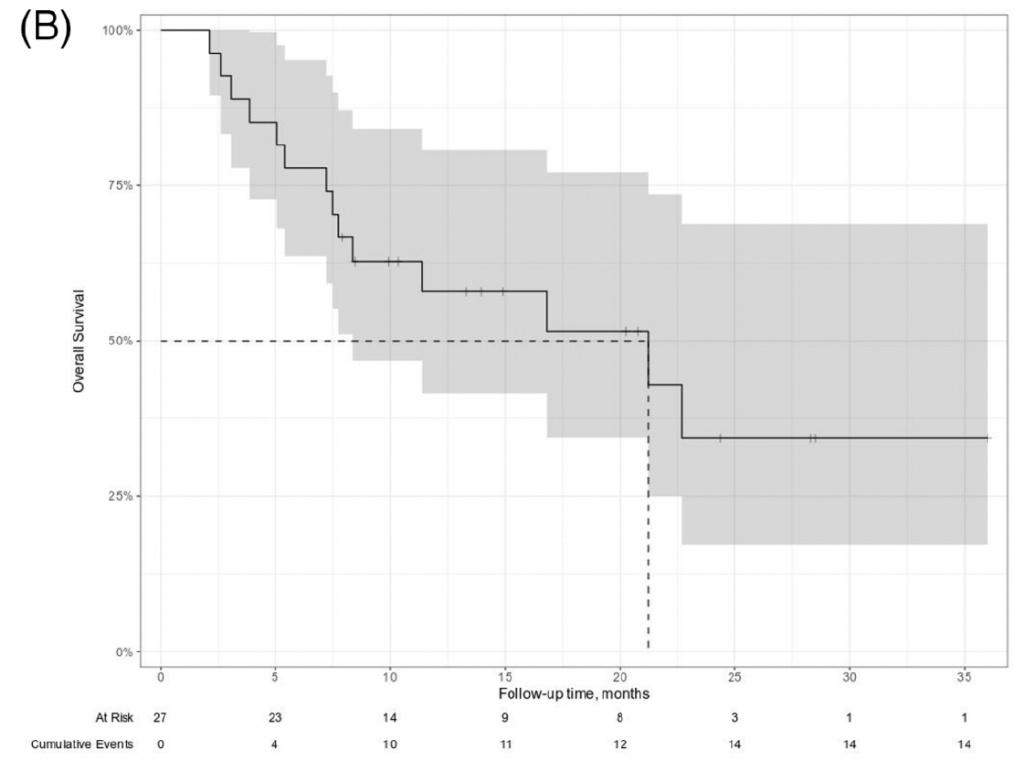 该研究纳入27例r/r-PCNSL患者,其中25例患者最终接受了CAR-T治疗,中位年龄68岁,既往平均接受了3线治疗(其中14例接受过ASCT,2例接受了全脑照射治疗),22例(81%)出现脑实质受累,8例(30%)存在脑脊液受累,仅有1例患者未接受桥接治疗。