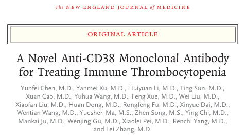 张磊教授:近期,我们团队在国际顶刊NEJM发表了抗CD38单抗治疗ITP的研究结果。抗CD38单抗既往主要应用于多发性骨髓瘤的治疗,但我们研究通过对20多例ITP患者的治疗,发现其对ITP治疗有非常显著的效果,有效率达到了90%,而且能够迅速提升血小板水平。特别是,研究在全球首次揭示了抗CD38单抗治疗ITP的可能机制,即不仅能减少破坏血小板抗体的产生,而且也能阻断巨噬细胞对血小板的破环,因此投稿后被NEJM迅速接受并发表。当然,这目前是一个单臂的临床研究,未来我们计划在全球进行多中心的随机对照临床研究,如果能够被证实,将会为ITP带来新的治疗方案,推动ITP治疗领域的变革。