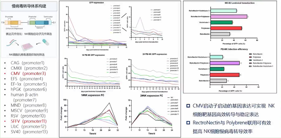 针对细胞来源的拓展,主要聚焦于NK细胞及其关键性科学问题的解决,包括NK细胞的扩增和转染。在扩增方面中,滋养层细胞是一种通用的、高效的扩增方式,可有效活化原代NK细胞。在转染方面,我们针对自体成熟NK细胞转染难、表达难的问题进行了优化,并对NK细胞的启动子元件进行筛选,发现CMV启动子启动的基因表达可实现NK细胞靶基因高效转导与稳定表达,RectroNectin与Polybrene联用可有效提高NK细胞慢病毒转导效率。