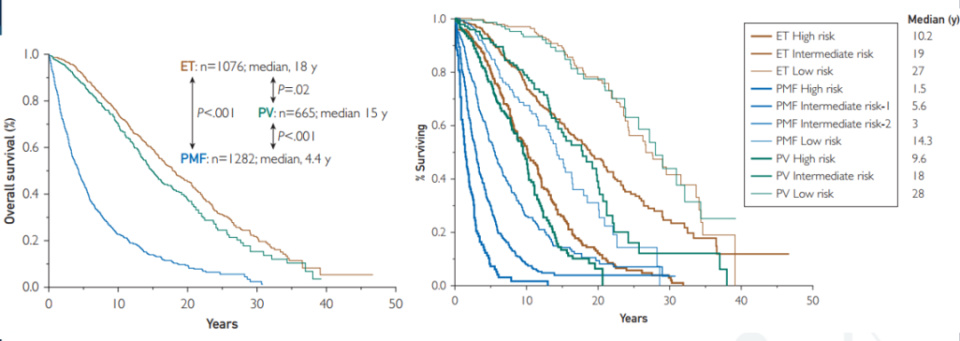不同的骨髓增殖性疾病预后不同,例如原发性骨髓纤维化(PMF)的中位生存时间仅有4.4年,而真性红细胞增多症(PV)和原发性血小板增多症(ET)分别为15年和18年。因此对骨髓纤维化病人进行危险分层十分重要。
