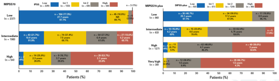 PMF的评分系统发展已较为完善,主要有以临床特征和实验室结果为依据的国际预后积分系统(IPSS)和动态国际预后积分系统(DIPSS),以及在此基础上添加了细胞遗传学诊断的DIPSS-Plus,随着分子生物学的发展相继演化出了突变强化国际预后评分系统(MIPSS-70)、MIPSS70-Plus、继发性骨髓纤维化预后模型(MYSEC-PM)、MPN Multistage评分,以及后期单纯以遗传学为依据的遗传学驱动预后评分系统(GIPSS)评分。