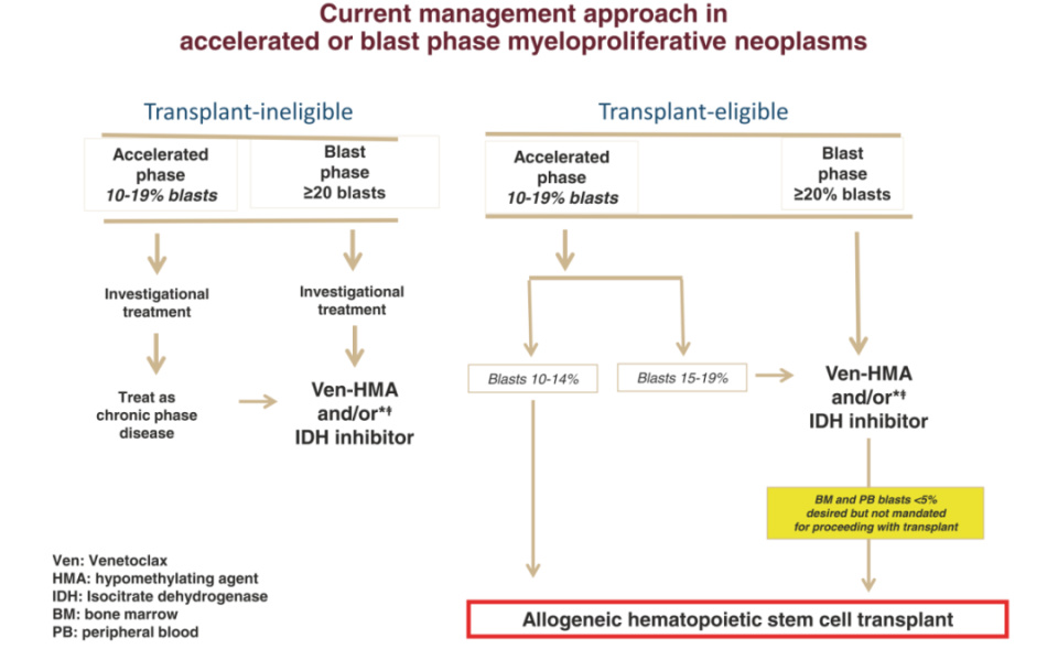 符合移植指征的加速期或急变期PMF患者应尽量进行移植,不符合指征者可使用维奈克拉联合去甲基化药物等治疗争取缓解。