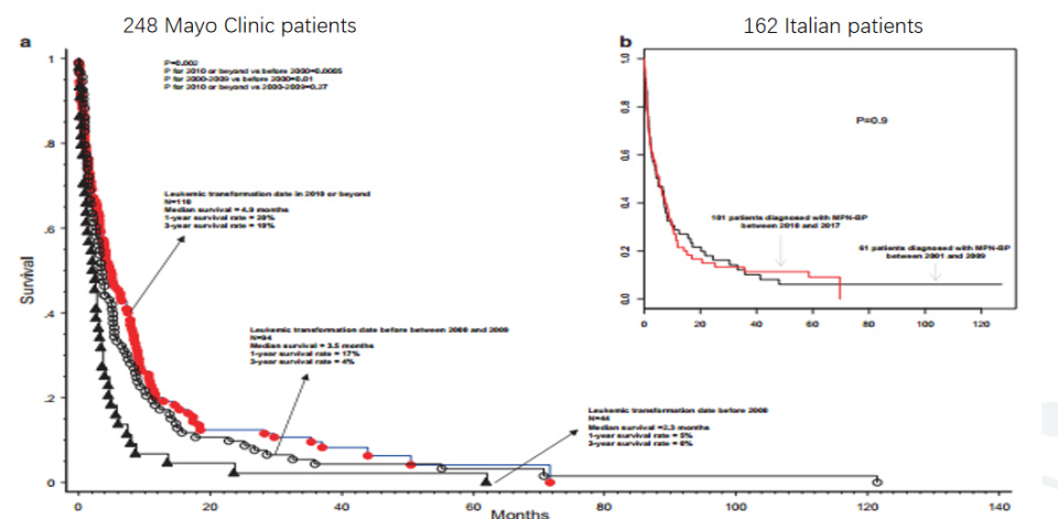 急变期PMF患者在髓系肿瘤中预后最差,长期生存率低于20%。