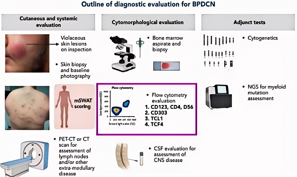 北美BPDCN同盟(NABC)从八个方面制定了完整的诊断方法(图3),包括皮损颜色外观、皮肤活检和照片、mSWAT评分标准(一种用于评估皮肤损伤严重程度的工具)、全身PET-CT(髓外部位)、骨髓穿刺和活检、流式细胞术、脑脊液(CNS评估)以及细胞遗传学和基因突变。