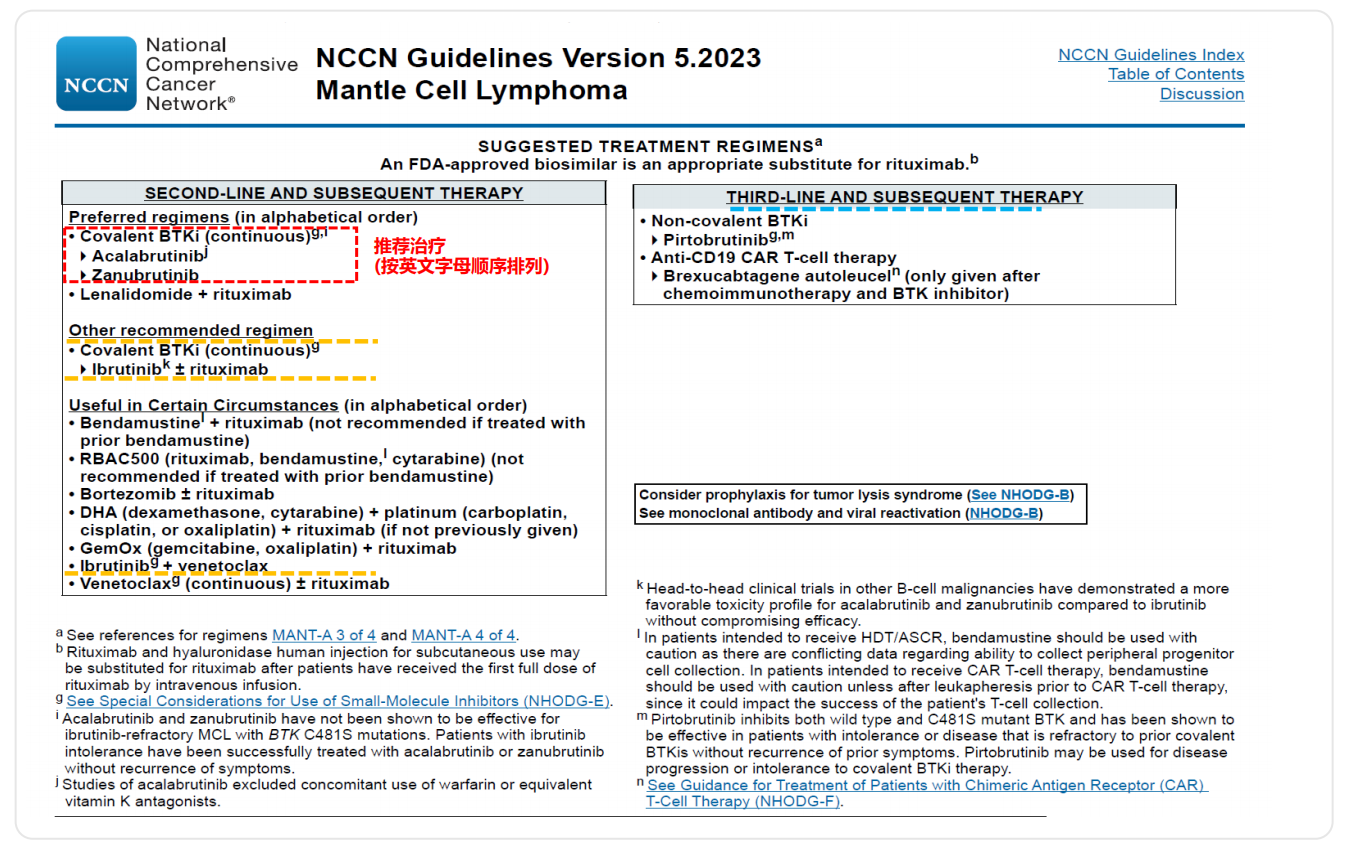 BTKis是在RR MCL治疗中显示出较优疗效的靶向药物。在2023 V5版NCCN指南中,已将共价BTKi(cBTKis)作为MCL的二线治疗优先被推荐[25]。