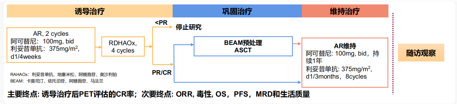既往研究显示,RDHAOx(利妥昔单抗、地塞米松、阿糖胞苷、奥沙利铂)用于ASCT的诱导治疗的CR率为77%[8]。2023 ASH大会公布的一项多中心II期单臂临床研究,共纳入44例初治MCL患者,中位年龄59岁,ECOG 0-1分占比98%,IV期占比84%,sMIPI中高危占比50%,Ki-67>30%占比68%,9%的患者为母细胞/多形性变型(研究设计见下图)。结果显示:AR(阿可替尼、利妥昔单抗)治疗2个周期后的客观缓解率(ORR)/CR分别为93%/57%,微小残留病(MRD)阴性率为18%;AR序贯RDHAOx治疗后的ORR/CR为95%/88%,MRD阴性率为94%,说明含阿可替尼三明治方案用于初治MCL可获得较高的缓解深度。而且该方案还具有较好的疗效和安全性,2年无进展生存(PFS)率为73.3%,2年总生存(OS)为79.3%,3~4级不良事件(AE)主要为血液学不良反应,AR导入治疗3级以上不良反应发生率少[9]。2023 ASH大会公布的Rectangle研究,是一项阿可替尼联合R-CHOP用于年轻初治MCL的II期研究,其中53例患者完成6周期阿可替尼+R-CHOP诱导治疗,48例序贯ASCT,46例接受AR维持治疗。结果显示,中位随访14.2个月,诱导治疗的ORR为98%,CR为92%,12个月PFS和OS率分别为95.4%和97.2%,且诱导和维持治疗均是安全可耐受的[10]。