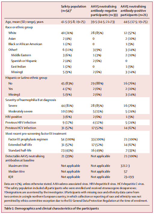 HOPE-B(Health Outcomes with Padua Gene; Evaluation in Haemophilia B)试验是一项3期、开放标签、单剂量、多中心试验,招募了18岁及以上的遗传性血友病B男性患者,分为重度(血浆因子IX活性水平<1%)或中度严重(血浆因子IX活性水平≥1%且≤2%),并具有严重出血表型,且正在接受稳定的持续因子IX预防治疗。患者接受了单次静脉注射etranacogene dezaparvovec(2×1013 gc/kg)。主要终点是在稳定因子IX表达期间(定义为治疗后7~18个月)的年化出血率(ABR)与至少6个月的导入期(患者在此期间接受常规的持续因子IX预防治疗)的非劣效性,并在此更新至治疗后24个月。在基因治疗后24个月进行了额外的后期疗效分析,包括调整后的ABR、因子IX活性、因子IX范围内的患者和因子IX使用情况,以及安全性分析。数据分析在全分析集(FAS)中进行,包括至少接受了部分基因治疗剂量的54例患者。