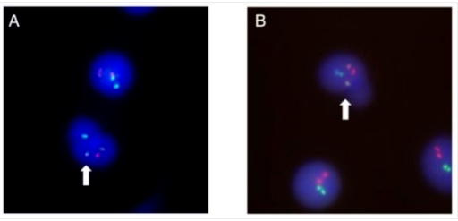 白色箭头表示BCR::ABL1融合信号,红色信号来自ABL1探针,绿色信号来自BCR探针