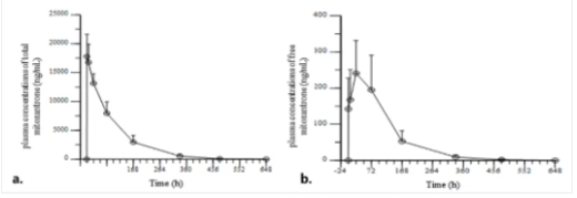 图3. 总米托蒽醌(a)和游离米托蒽醌(b)的血浆浓度时间曲线