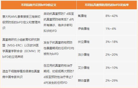 表1.不同指南共识的bIFD定义和不同抗真菌预防用药的bIFD发病率[2-5]