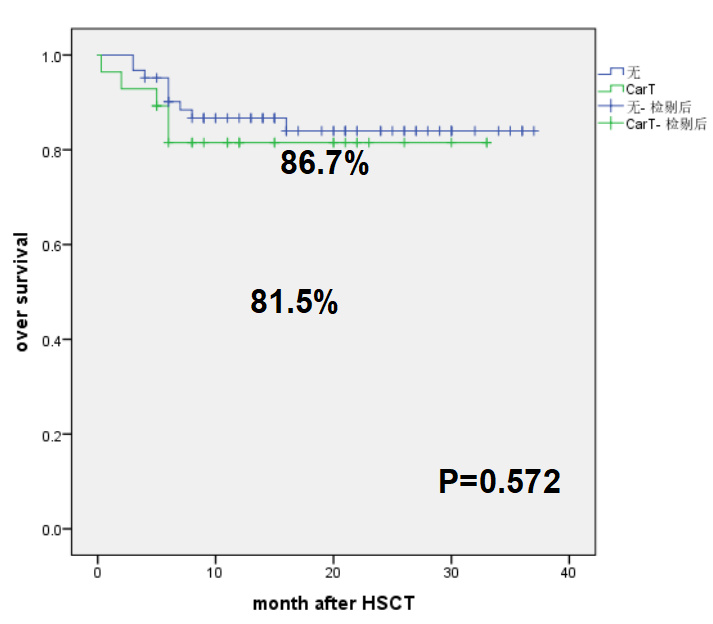 59例为移植前首次达到血液学缓解(CR1)。其中CAR-T组14例,化疗组45例。31例患者移植前至少血液学复发过1次,经过治疗再次达到血液学缓解(≥CR2)。其中CAR-T组14例,化疗组17例。