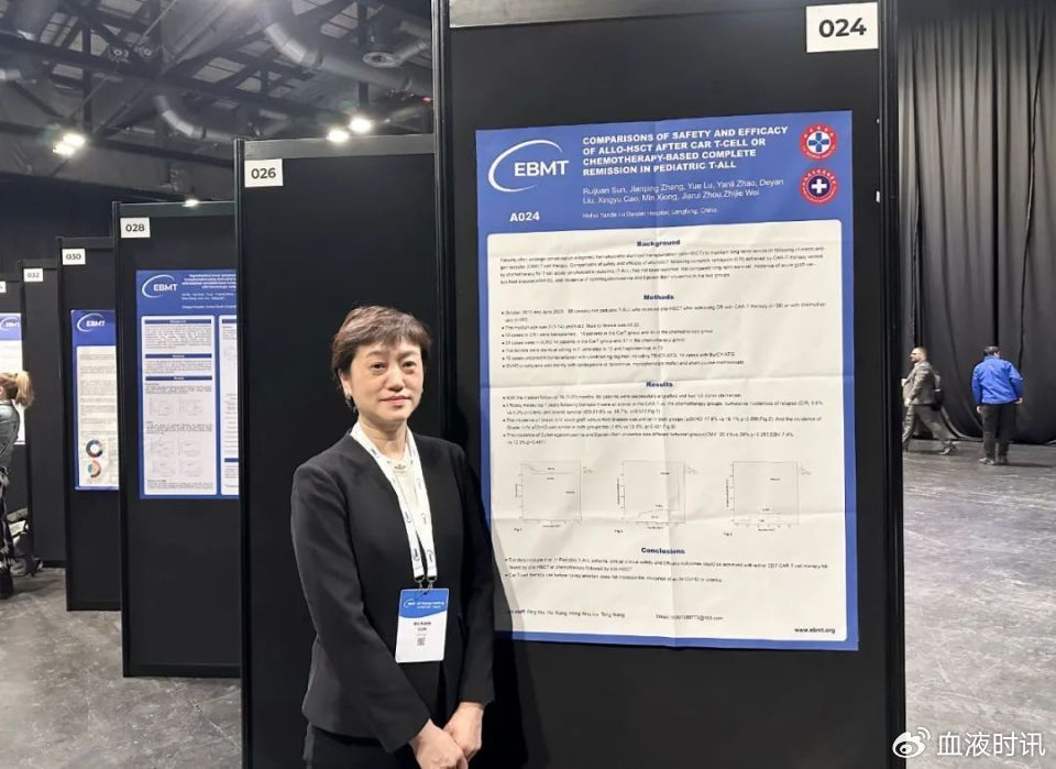 编者按:2024年4月14日至17日,第50届欧洲血液和骨髓移植学会(EBMT)年会在英国格拉斯哥隆重举行。会议聚焦干细胞移植和细胞疗法的最新进展,推动着血液病及血液肿瘤患者向着更好的临床预后迈进。在本届大会上,我国学者河北燕达陆道培医院孙瑞娟教授团队的一项研究被大会收录进行壁报交流,研究揭示了采用CD7-CAR-T细胞治疗桥接干细胞移植与与同期接受化疗达到缓解后桥接移植在治疗儿童急性T细胞淋巴细胞白血病中具有相似的有效性及安全性。本刊特邀请孙瑞娟教授第一时间与广大同道分享该项研究成果及其临床意义。