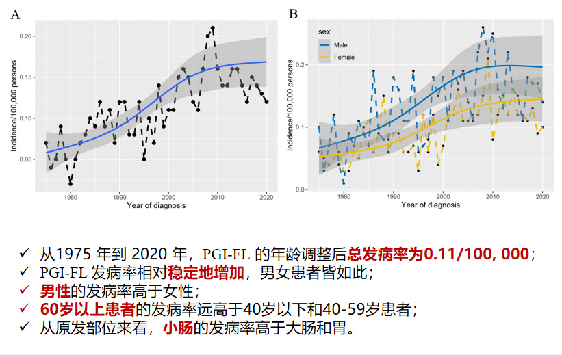 研究显示,PGI-FL的发病率极低,经年龄调整后的PGI-FL年平均发病率为0.111/10万,且其发病呈逐年增加的趋势。无论在男性还是女性患者中,这一趋势都同样明显,尽管男性的发病率略高于女性。年龄分布上,60岁以上的患者数量远超过60岁以下的患者群体。从发病部位来看,小肠的发病率显著高于大肠和胃。