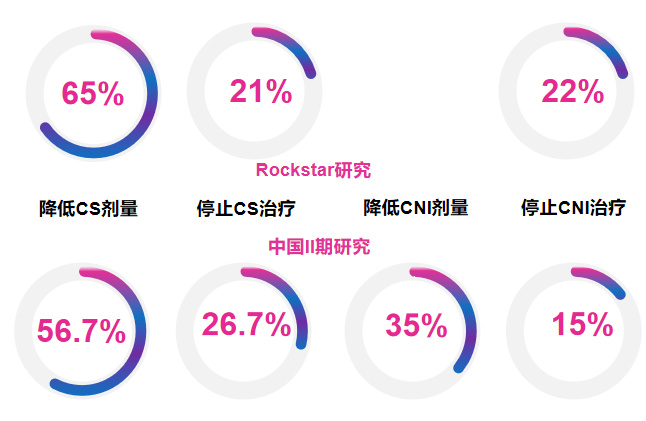 随机、开放标签、国际多中心关键性II期研究ROCKstar20 ,共纳入132例接受过2-5线系统性治疗后出现持续活动性cGVHD表现的患者,98%为中重度,伴有多器官受累和纤维化表现,中位随访14个月。贝舒地尔中国II期研究(n=20)22的重度患者占比高达66.7%,中位随访12.9个月。两项研究均证实,贝舒地尔改善缓解和生存,可减少免疫抑制剂使用,可进一步助益GVL效应的保留(图4、5)。