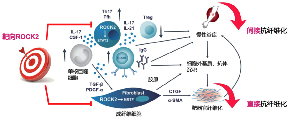 贝舒地尔作为一种高选择性ROCK 2抑制剂,通过精准调控ROCK 2信号通路,可同时在cGVHD的炎症阶段和纤维化阶段发挥作用,具有抗炎和抗纤维化双重作用。贝舒地尔调控STAT3依赖的促炎因子(如IL-17、IL-21)分泌,同时通过调控STAT5恢复Treg细胞功能,重建免疫稳态。此外,贝舒地尔对纤维化进程的影响包括直接和间接作用:一方面,贝舒地尔通过作用于cGVHD炎症阶段,减少纤维化的进一步形成;另一方面,贝舒地尔直接作用于成纤维细胞中的ROCK 2靶点,阻断成纤维细胞分化成肌成纤维细胞,并诱导已存在的肌成纤维细胞凋亡,同时减少胶原蛋白的沉积,发挥直接地抗纤维化作用(图1)9-10。贝舒地尔的出现改变了cGVHD的治疗理念,从单纯的抗炎升级到抗炎+逆转纤维化,为患者带来了新希望。