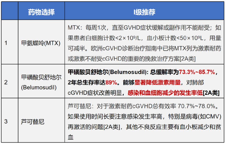 地位跃迁:贝舒地尔在cGVHD二线治疗中调整为I级推荐,并领航二线靶向药物1。