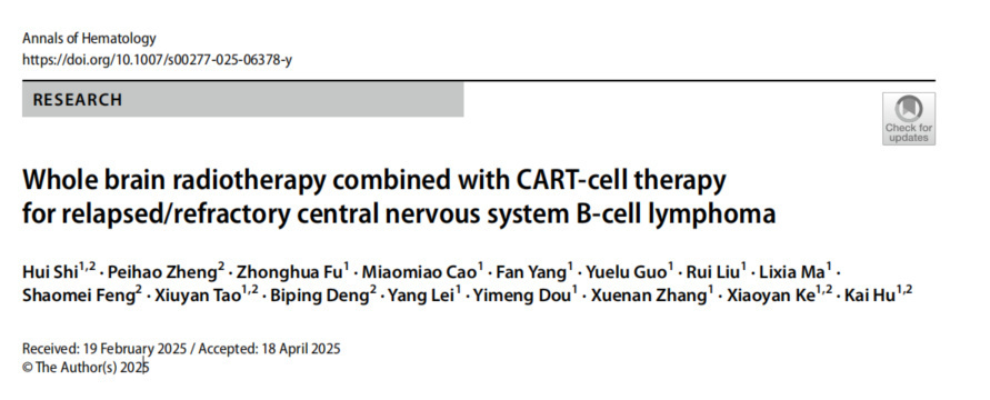 参考文献:HuiShi,...· Kai Hu.Whole brain radiotherapy combined with CART-cell therapy for relapsed/refractory central nervous system Bcell lymphomaAnnals of Hematology.https://doi.org/10.1007/s00277-025-06378-y.