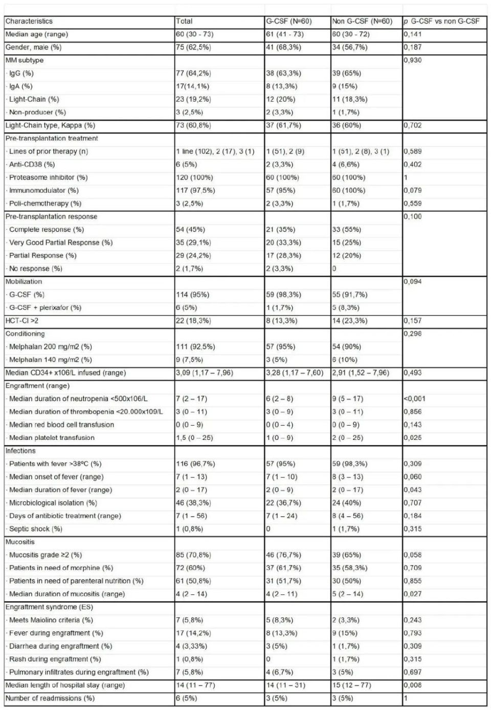 方法:本研究是一项回顾性对照研究,纳入了根据临时标准接受或不接受预防性G-CSF治疗的两个MM患者队列。共纳入120例连续患者:第一队列为2016年8月至2019年2月接受auto-HSCT的60例患者,从第+6天起接受G-CSF治疗直至中性粒细胞>500×10⁶/L持续3天;第二队列为2019年3月至2020年10月接受auto-HSCT的60例患者,未使用G-CSF。本研究使用SPSS v.28统计软件进行回顾性观察对照,分析了两组队列的患者特征、疾病特征、移植特征、造血恢复指标、严重感染数据、黏膜炎、ES数据(依据Maiolino标准)、住院时间、再入院率以及1年无进展生存期(PFS)和总生存期(OS)。