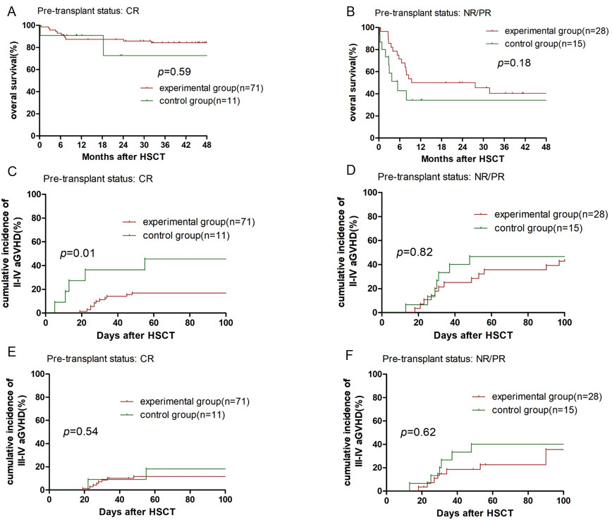 在移植前达到CR的患者中,试验组的100天II-IV级aGVHD发生率显著低于对照组(16.9% vs. 45.5%,P=0.01)。然而,III-IV级aGVHD的发生率无显著差异(11.5% vs. 18.2%,P=0.54)。在NR/PR患者中,II-IV级aGVHD(46.4% vs. 46.7%,P=0.82)和III-IV级aGVHD(35.5% vs. 40%,P=0.62)的发生率在两组之间无显著差异。